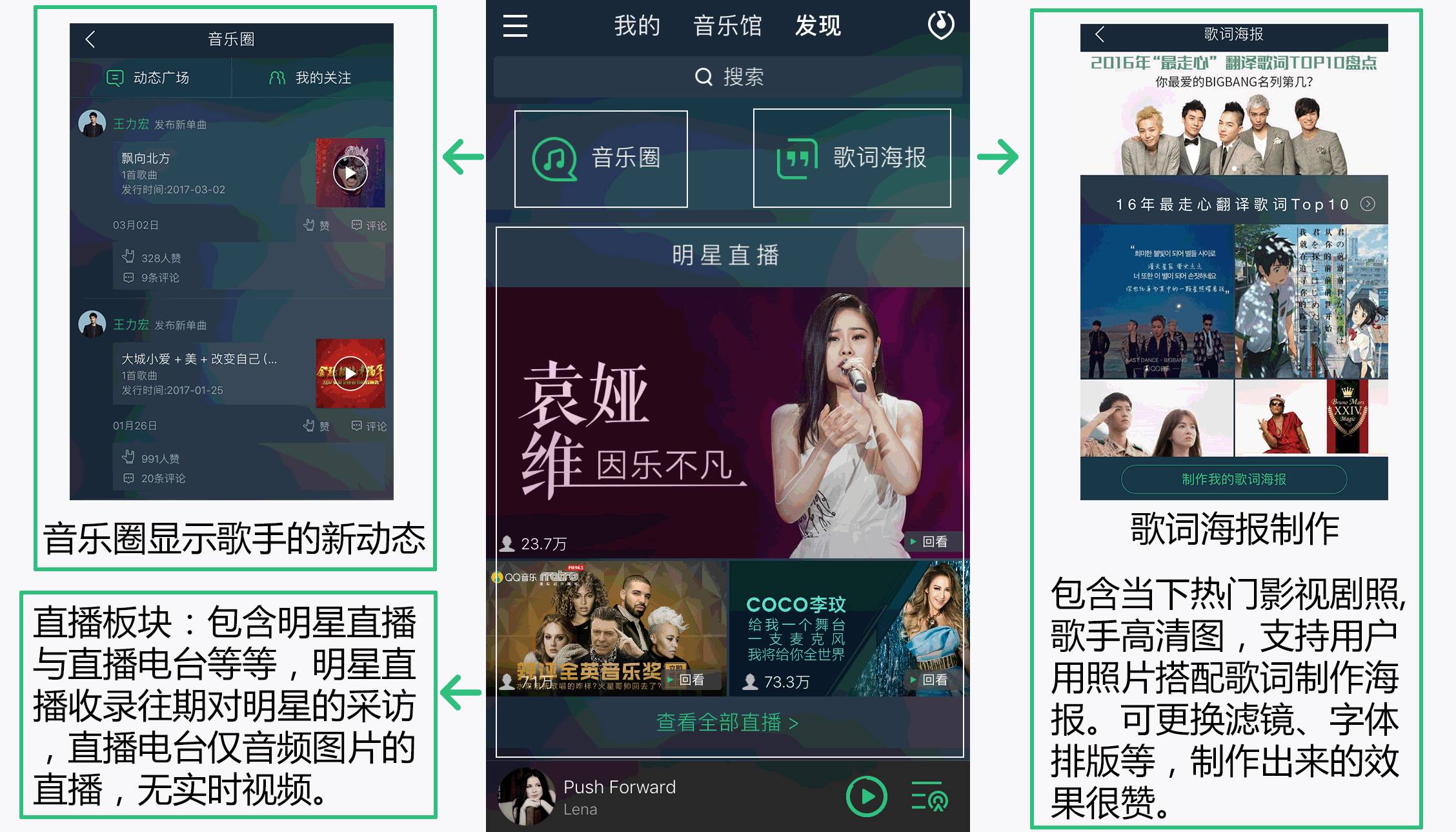 之前提到QQ音乐与很多热门音乐综艺合作,如《王牌对王牌》、《梦想的声音》、《我是歌手》等等。将现场版的演唱歌曲以音频的方式输出,并可一键点击观看节目中的此曲视频;不仅如此,歌手现场版的歌曲、腾讯livemusic直播的演唱会、专访节目《乐见大牌》也都一一收录,粉丝可以在同一个软件上看到偶像更多信息、视频、花絮。