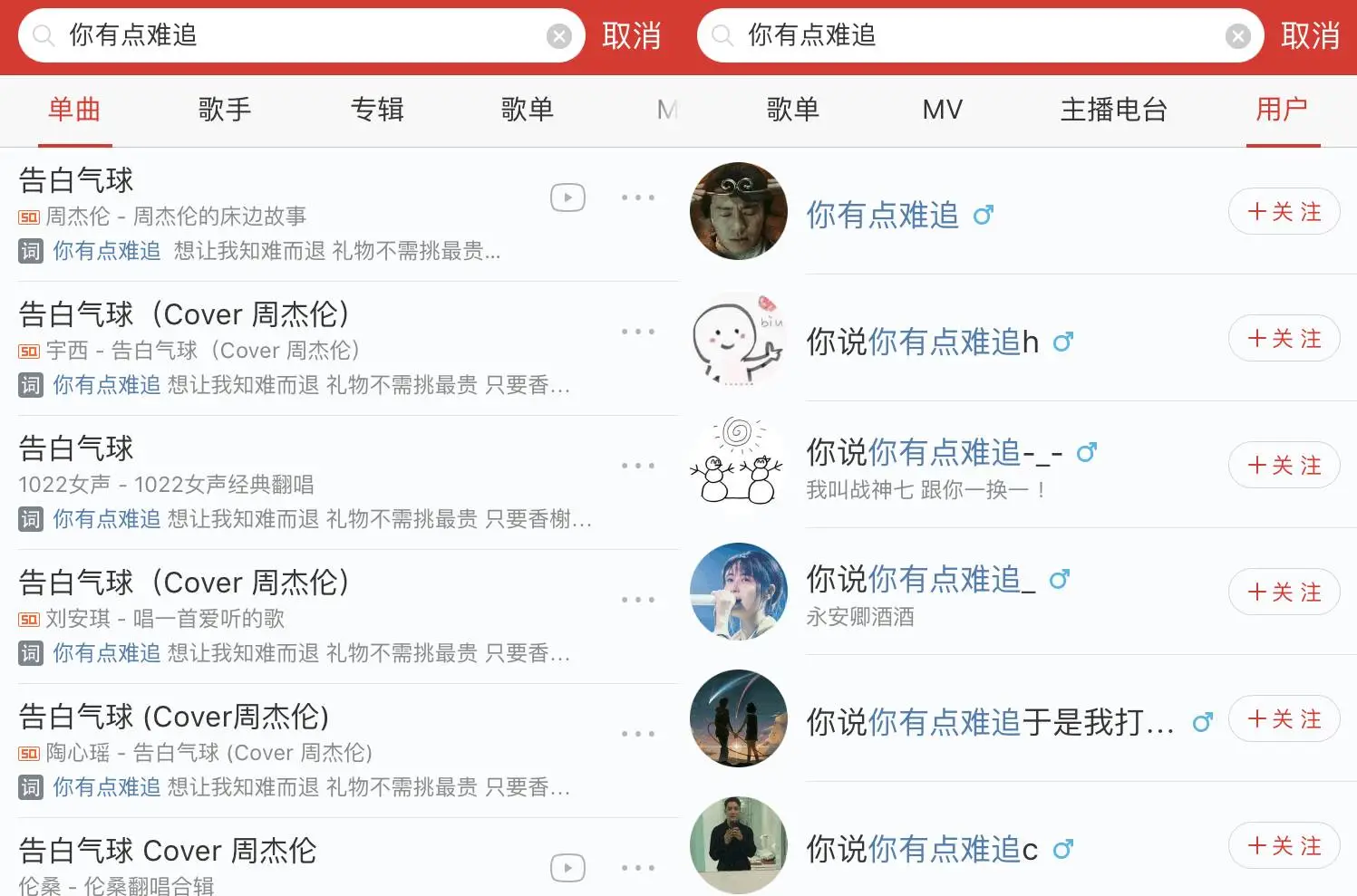 网易云音乐在搜索功能上支持歌手、歌曲名、歌词、歌单名的搜索,分类显示,能够满足对歌曲有精确印象的用户搜索动作,另外,云音乐增加了对于用户的搜索结果,符合云音乐的社交定位。