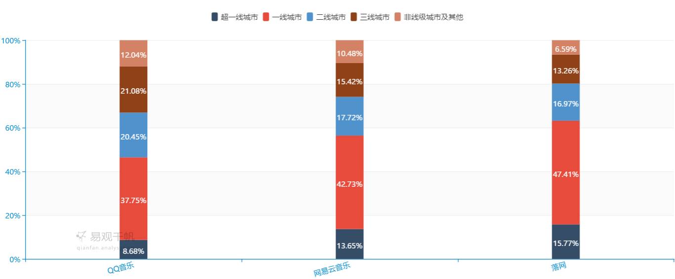 通过对于用户地域的分析可看出,QQ音乐用户在各线城市的分布都较为均匀,网易云音乐用户在一线以上城市的分布相对较高,落网的用户则在一线以上城市的分布超过了60%。