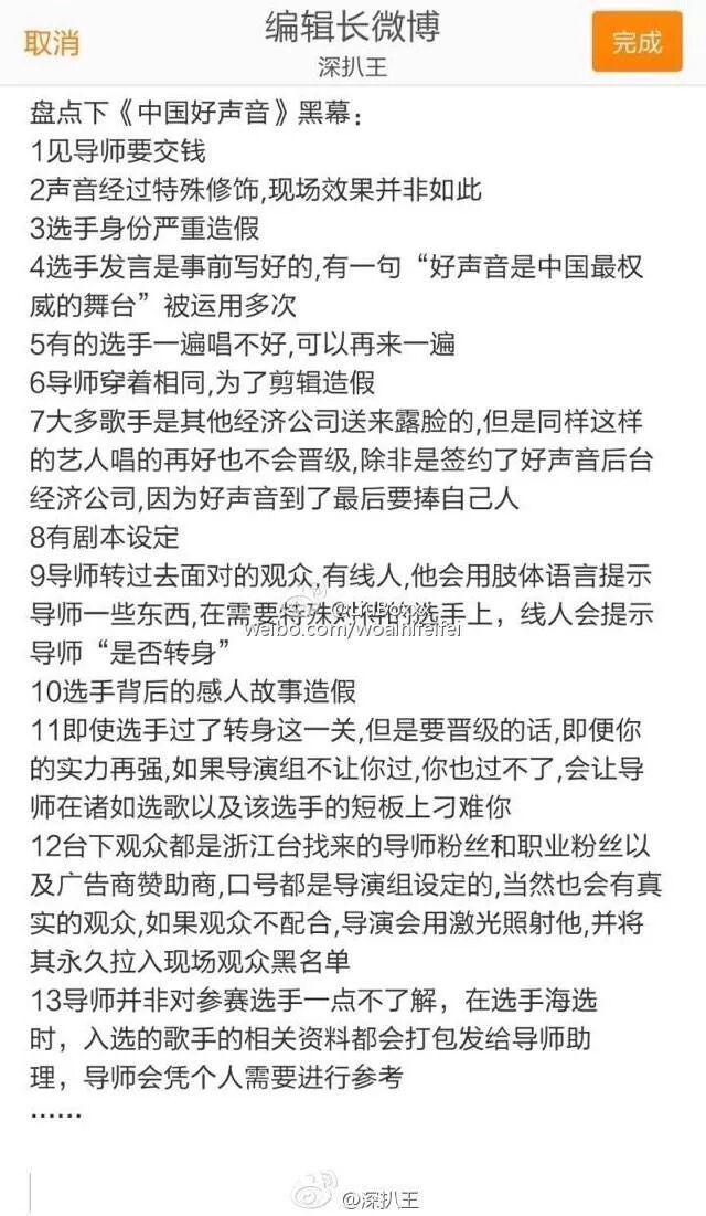 以上种种的剧本说,导演干预说,剪辑说,签约内定说,都印证了该节目确实存在不为人知的很多内幕。有网友调侃说我就没有见过好声音白过。不过就像网友们说的真人选秀哪有真实的。
