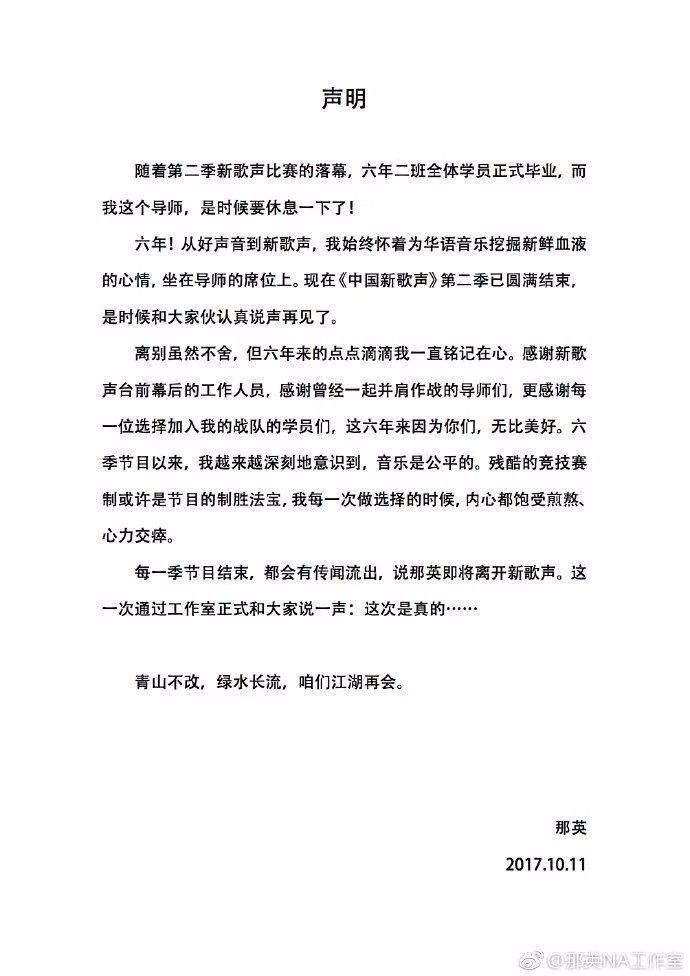 不仅收视率低到不能再低,就连唯一一位连续6年都在的导师那英也在近日宣布退出,不再担任中国新歌声的导师。