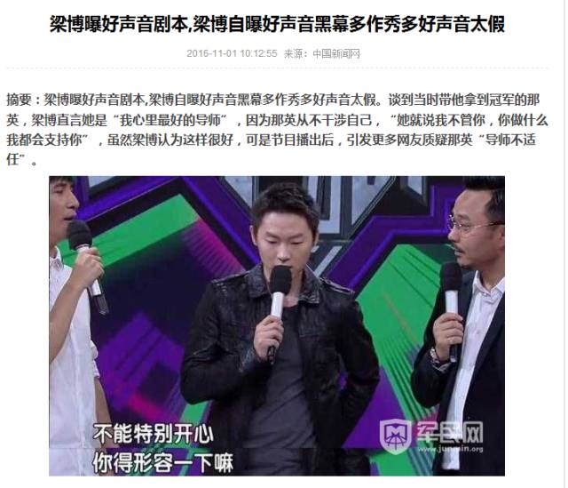 好声音第一季冠军梁博也曾在事后的采访就耿直揭示过导演组的暗箱操作