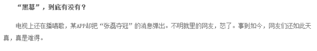 更多网友的爆料是,第四季冠军张磊还没唱完歌时,音乐APP上就已经提前推送出了张磊夺冠的消息,这是很明显的内定黑幕了。