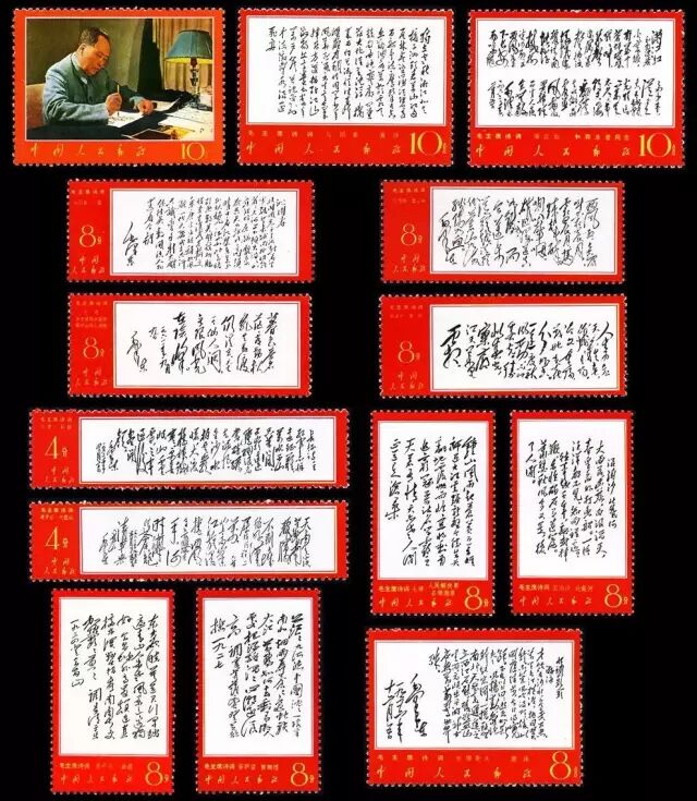 为庆祝建国18周年,邮电部于1967年10月1日发行了文7《诗词》邮票。全套14枚邮票。