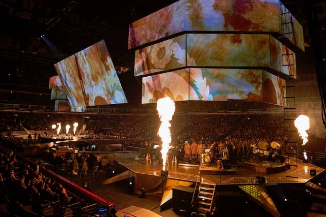 整个演出所需要的道具,足足用了15辆巨型大卡车来装载;全场使用了255套专业舞台设备;7个特别定制的巨型舞台;每场演出都用至少12桶燃油完成喷火效果....