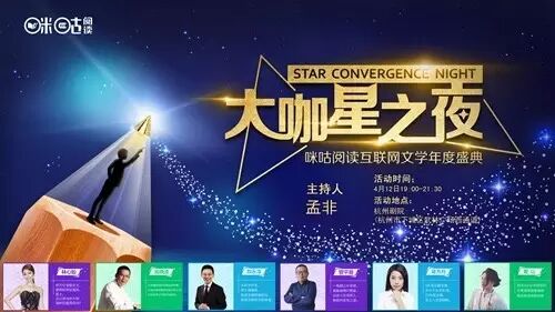 4月12日,6位颜智双高大咖,近百位原创文学潜力新秀云集咪咕阅读“大咖星之夜”,就文学创作、数字出版及IP经济进行思想碰撞,一同讨论阅读的过去、现在、未来,同时揭晓年度好书九大奖项。