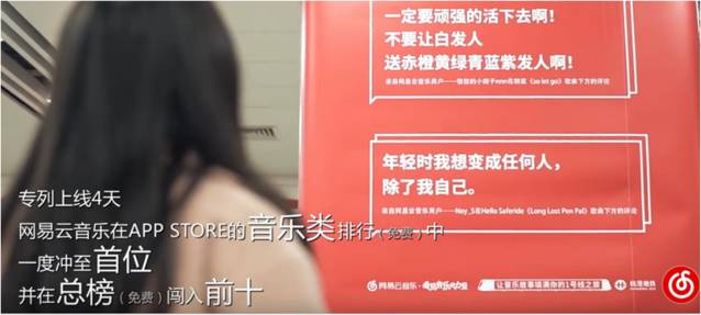 今年3月20日,网易云音乐和杭港地铁联合推出了“乐评专列:看见音乐的力量”的营销活动,其中85条高点赞的歌曲评论遍布地铁1号线和江陵路地铁站。匆匆而过的行人,很多都被这些话语戳中内心最柔软的地方。