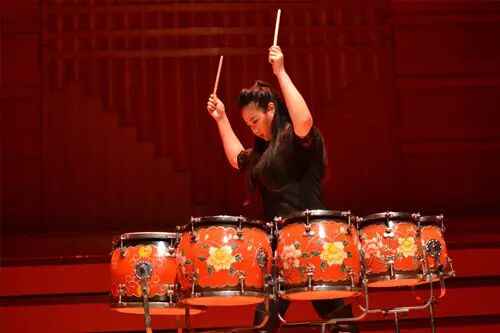 音乐会由中乐系青年教师王韵铭一首热闹欢快的民族打击乐曲目《鼓上飞舞》拉开序幕。