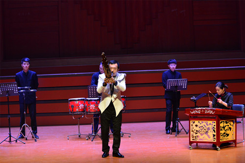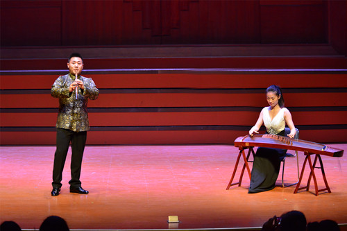 ,随后,他还和中乐系研究生王晓旻共同登台,为大家带来了一首由中乐系荣政教授编曲的《秋思曲》,他的演奏沉稳大气,极富舞台表现力。