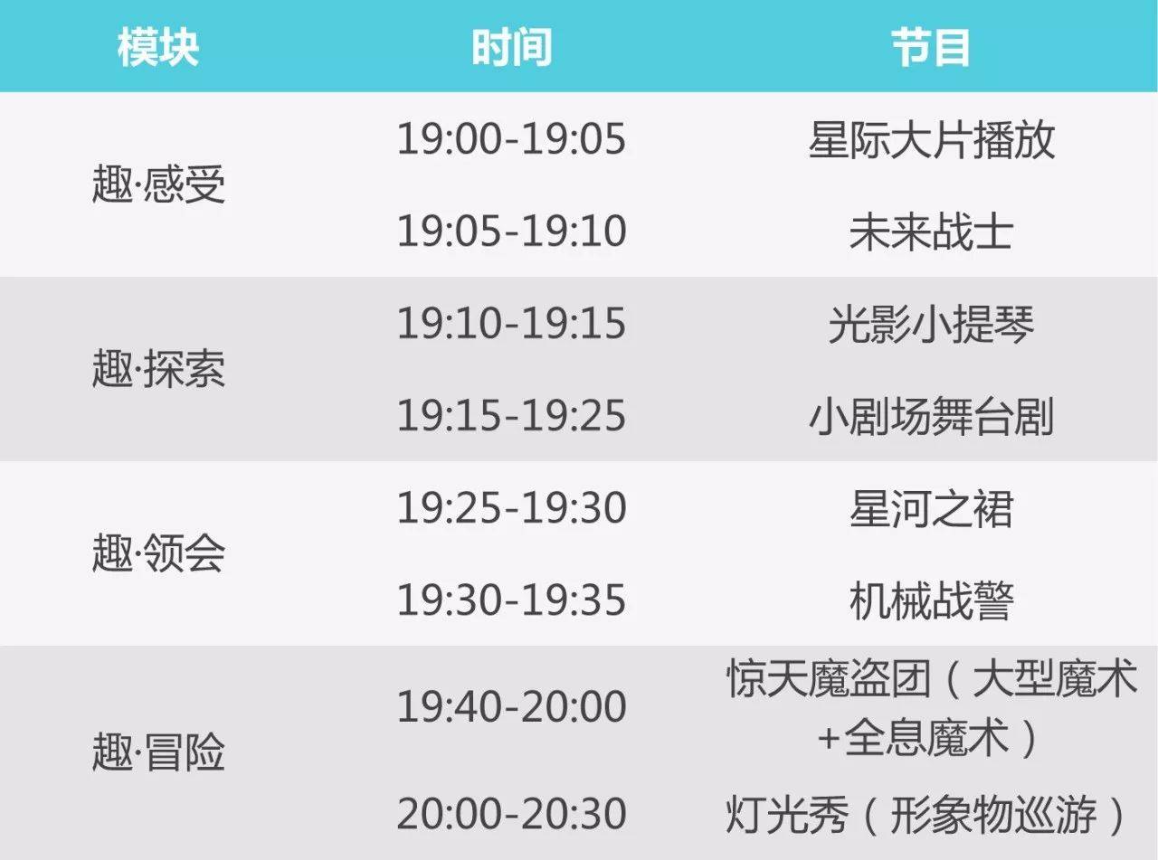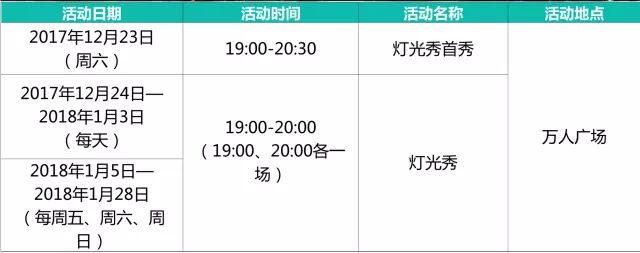 从12月24日开始一直到明年1月3日,每晚19:00、20:00各有一场灯光秀,每场秀大约持续25分钟;从明年1月5日到1月28日,灯光秀将安排在每周五、六、日晚举行,广场大型活动日除外。