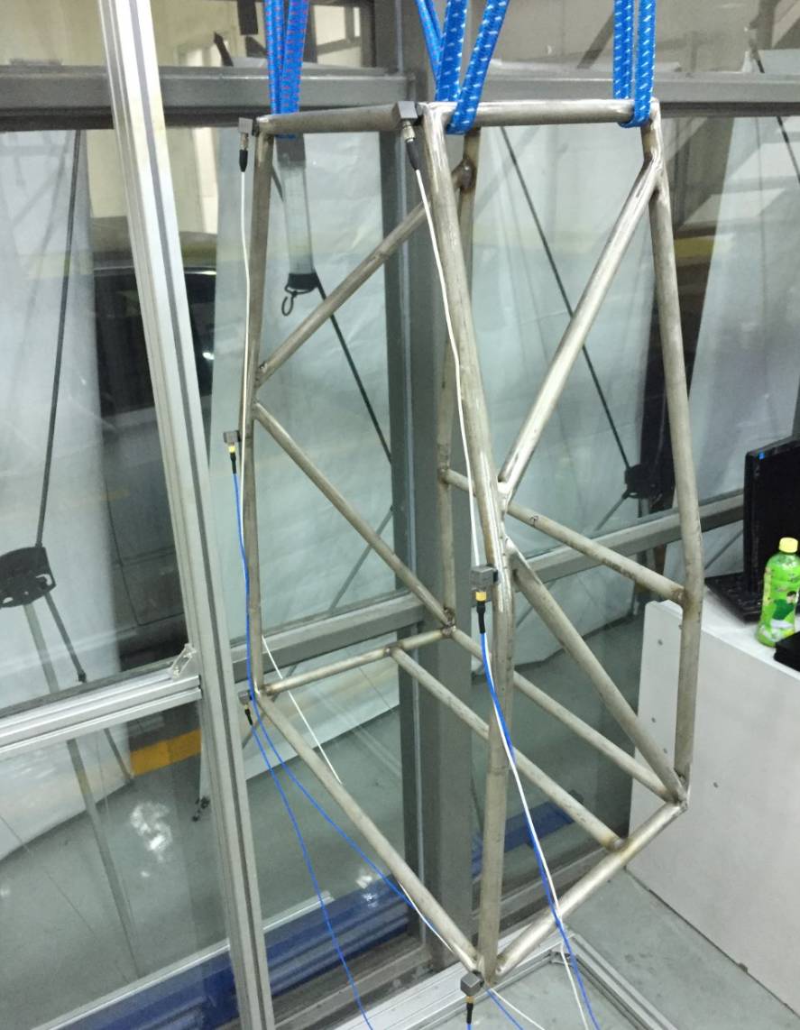 由于车架结构相对简单,因此考虑使用锤击法进行模态分析。此方法需要的设备较少,易于设置,相对试验用时较少,很适用于简单结构的模态测量。如下图所示,先使用弹簧绳将车架模型悬吊在实验台架上,使其处于自由自由的边界条件状态。在车架正面安置6个PCB单轴加速度传感器,并连接到美国晶钻仪器的Spider-80X多通道数据采集模块上。