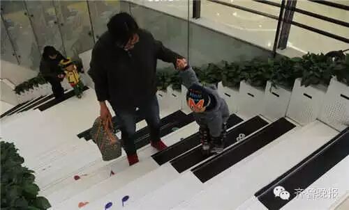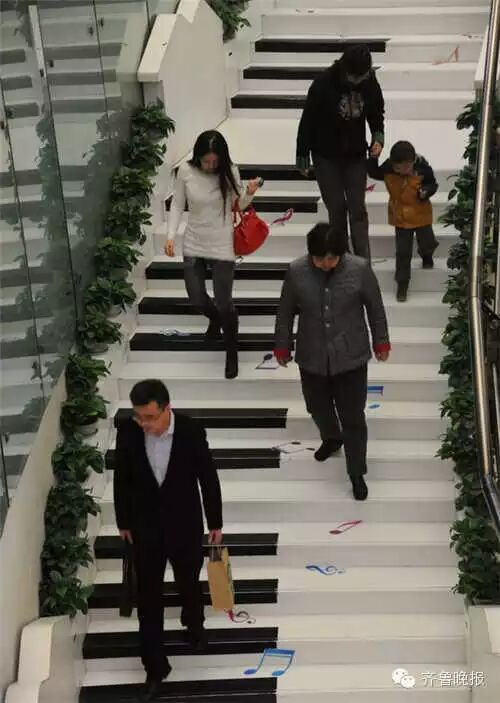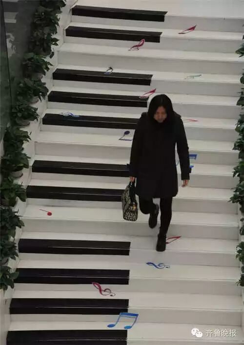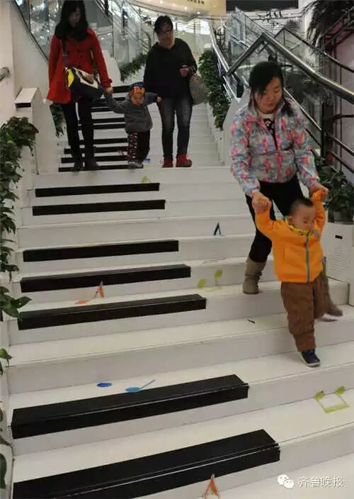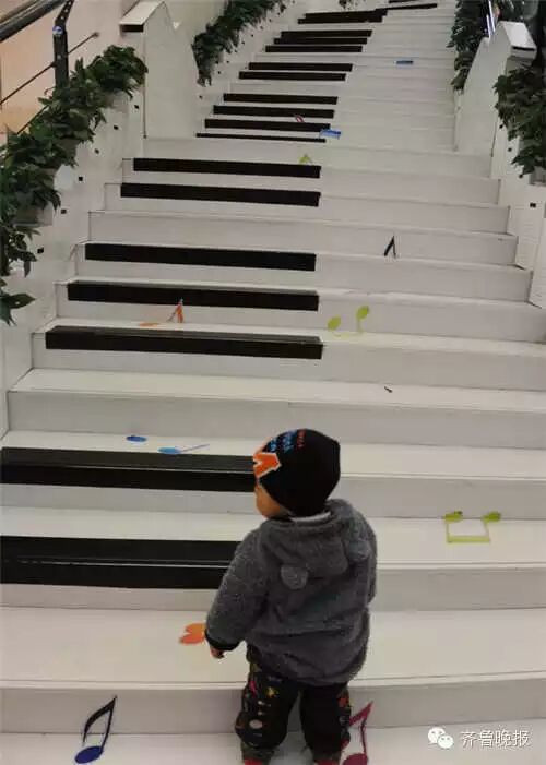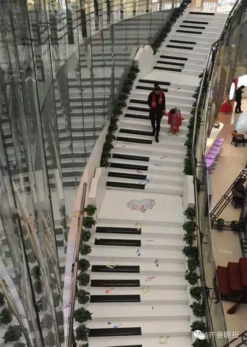 13日,在济南和谐广场内,出现会发声的“钢琴楼梯”,吸引众多好奇的市民前来体验这个特殊的 “钢琴楼梯”。 楼梯黑白相间相当于钢琴的键盘,只要踩到楼梯上即可发出美妙的乐声。