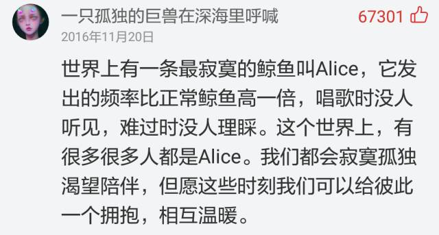 世上有一条最孤独的鲸叫Alice,它发出的频率比正常鲸鱼高出一倍,唱歌时没人听见,难过时没人理睬。在这个世界上,有很多人都是Alice。我们都会寂寞孤独渴望陪伴,但愿这些时刻我们可以给彼此一个拥抱,相互温暖。
