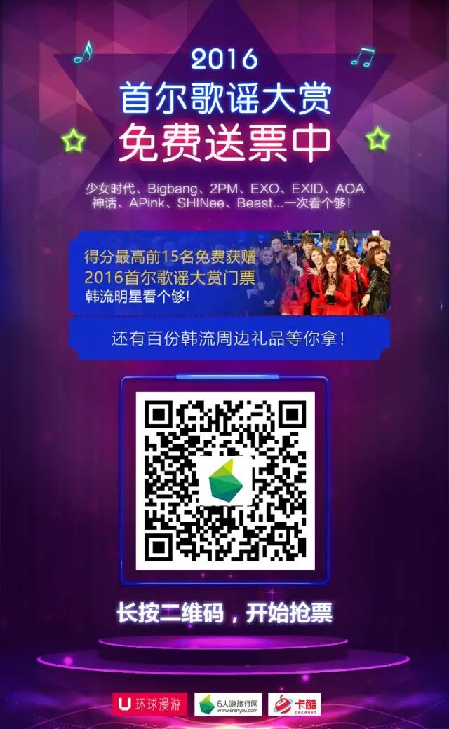 长按下方彩图中的二维码识别,或点击“阅读原文”,进入6人游APP参与活动,马上开抢2016首尔歌谣大赏免费门票,以及上百份韩流周边礼品~