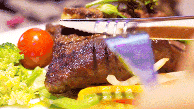 切开后明显看到和普通牛扒的不同,经过低温分子料理机对温度的精确掌控,肉质的颜色尤为粉嫩。切开一小块放进嘴里,口感较嫩且松化、多汁不肥腻,咬得爽,嚼着嫩,吃着香的绝佳口感!!!