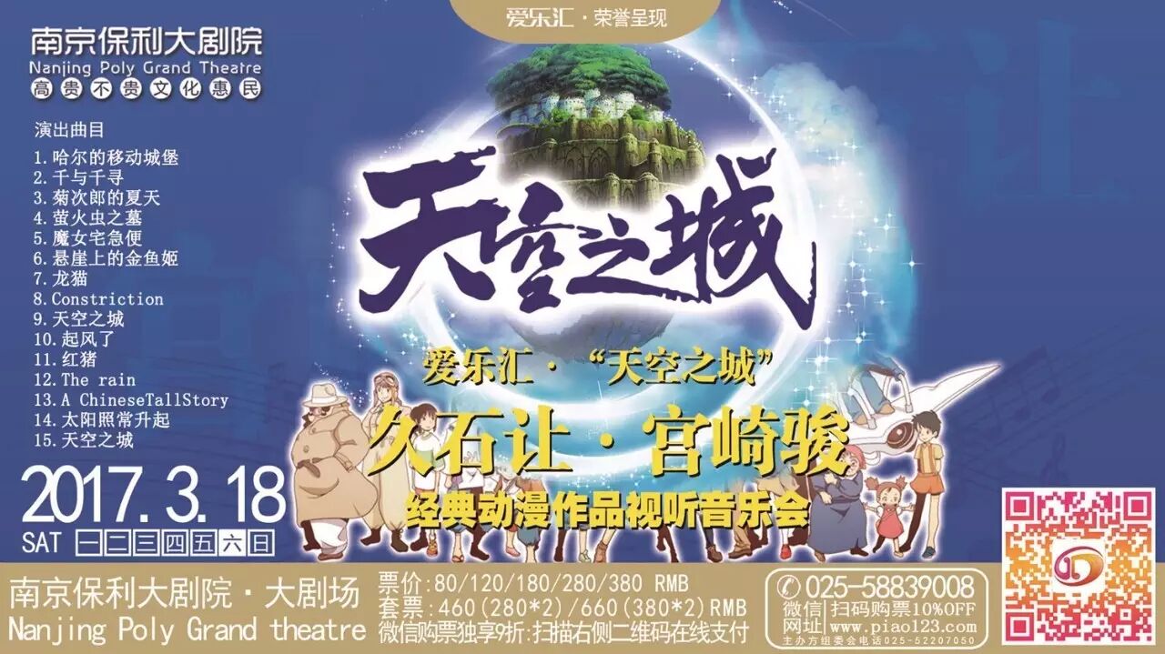 久石让《天空之城》以他那充满童心,却又能够阐释哲理的灵性音乐创作,被人们称为触动灵魂的音乐。宫崎骏《天空之城》可谓是日本动漫当中最具知名度和最受大家喜欢的作品。当久石让遇上宫崎骏,一部部经典动漫随之诞生,一首首音乐传奇划过心际。他们是世界动漫史上的传奇,他们将世界动漫带入了一个黄金时代。感动了70、80、90后的三代人,留下了美好无比的同年回忆。2016年元旦该音乐会曾在南京保利大剧院隆重上演,演出前一周全场1900张票全部售罄,近百张加座票也一抢而空。今年该乐团将在3月18日再次抵宁,再掀热潮,目前仅剩少量余票。