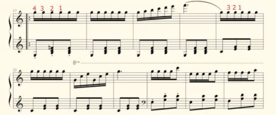 本课非常非常重要,唯一的一课轮指练习。车尔尼599中的第68条、车尔尼849的第12条、车尔尼740的 第7条 、第35条中也有这样的片段,贝多芬的《献给爱丽丝》,李斯特的《梅菲斯托》、《侏儒舞》也有运用这样的表现手法。