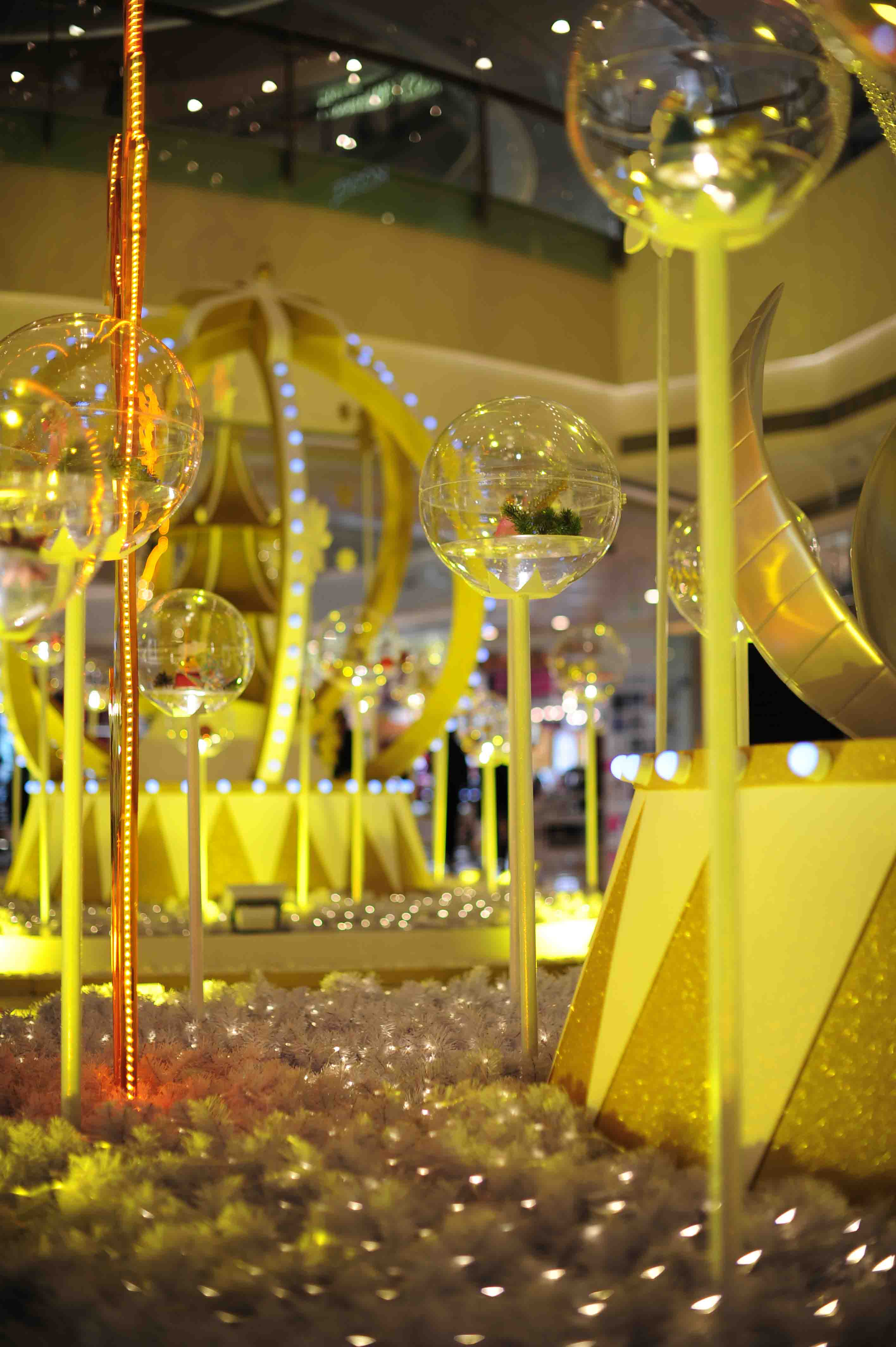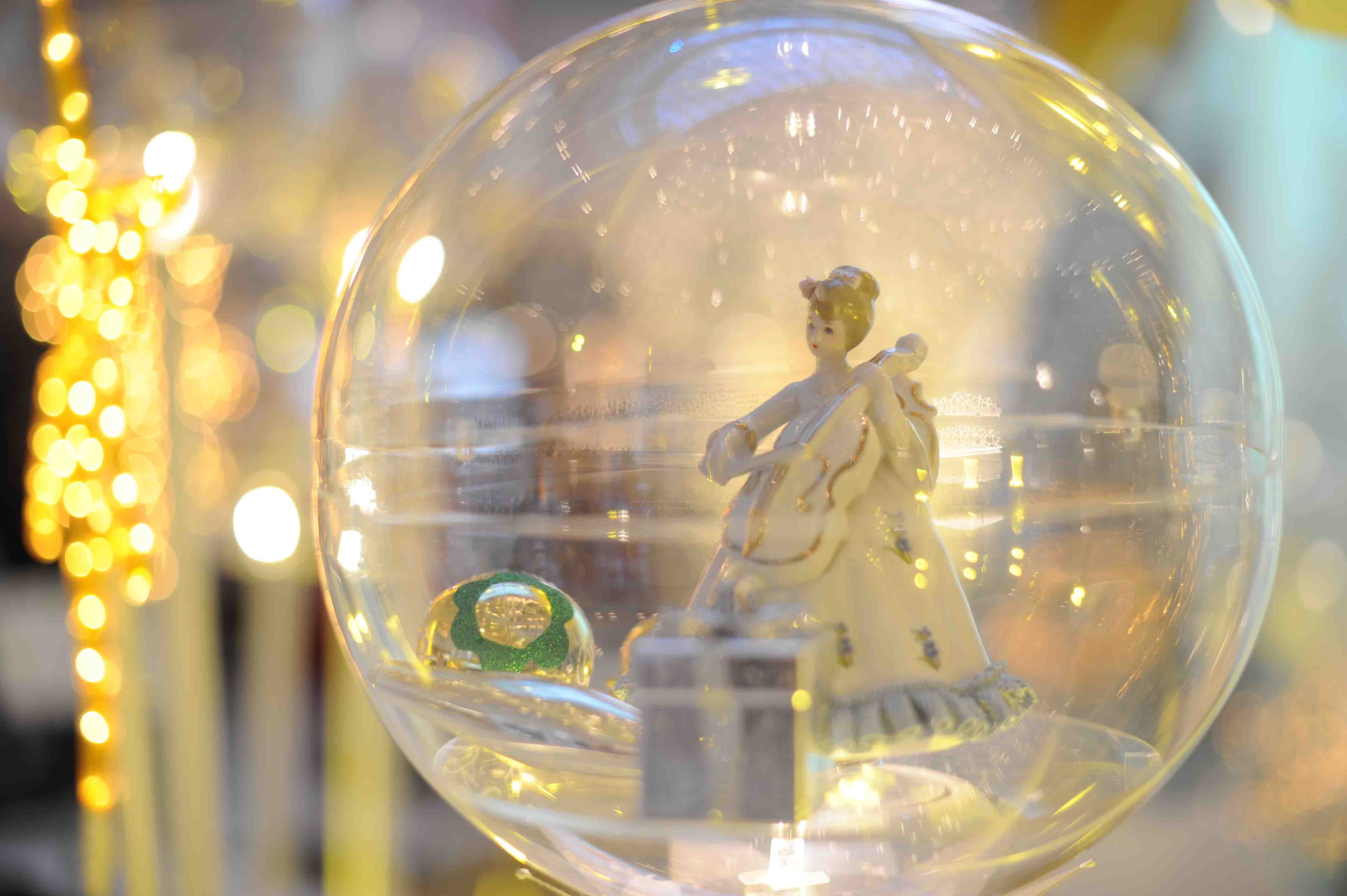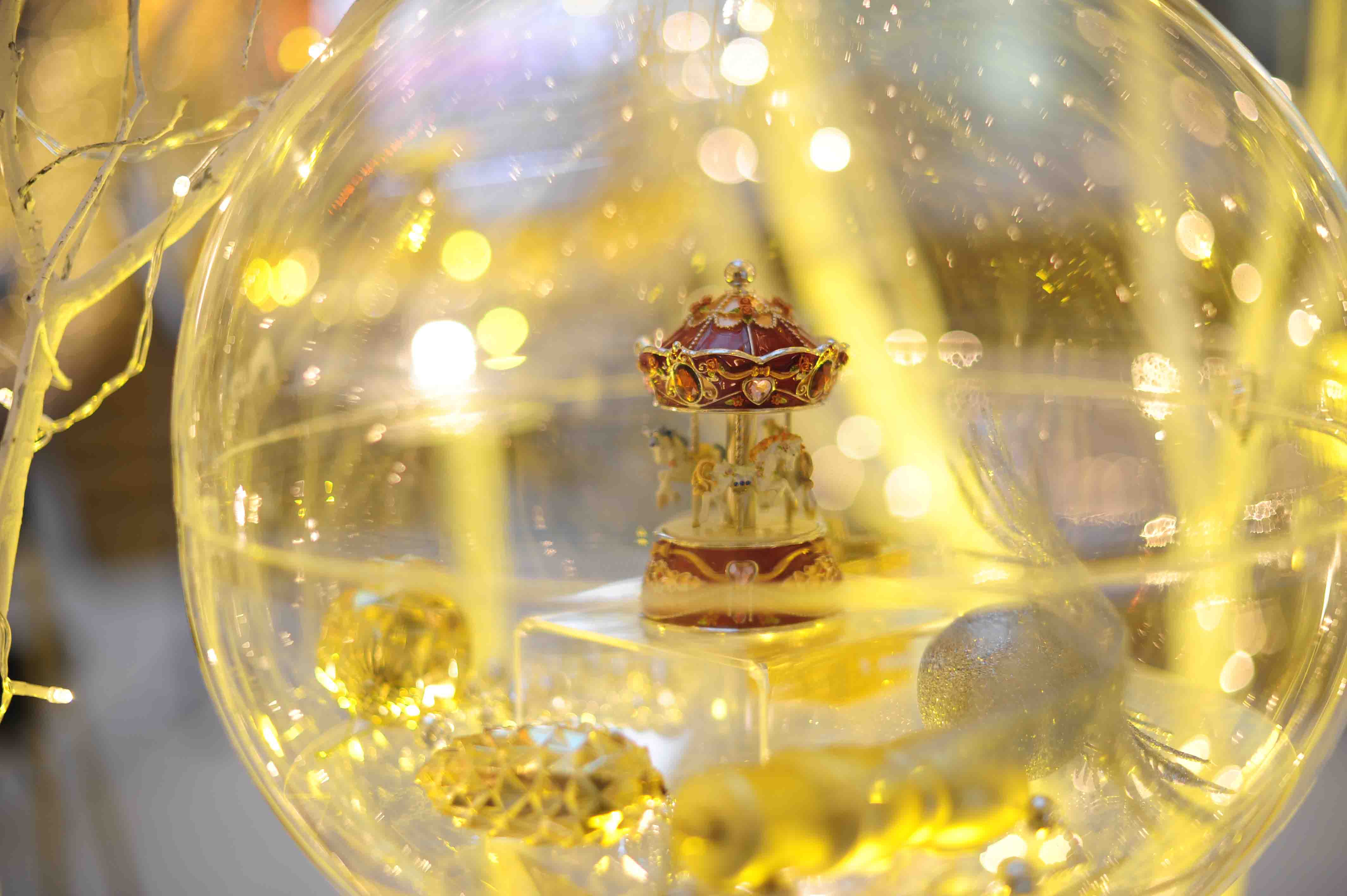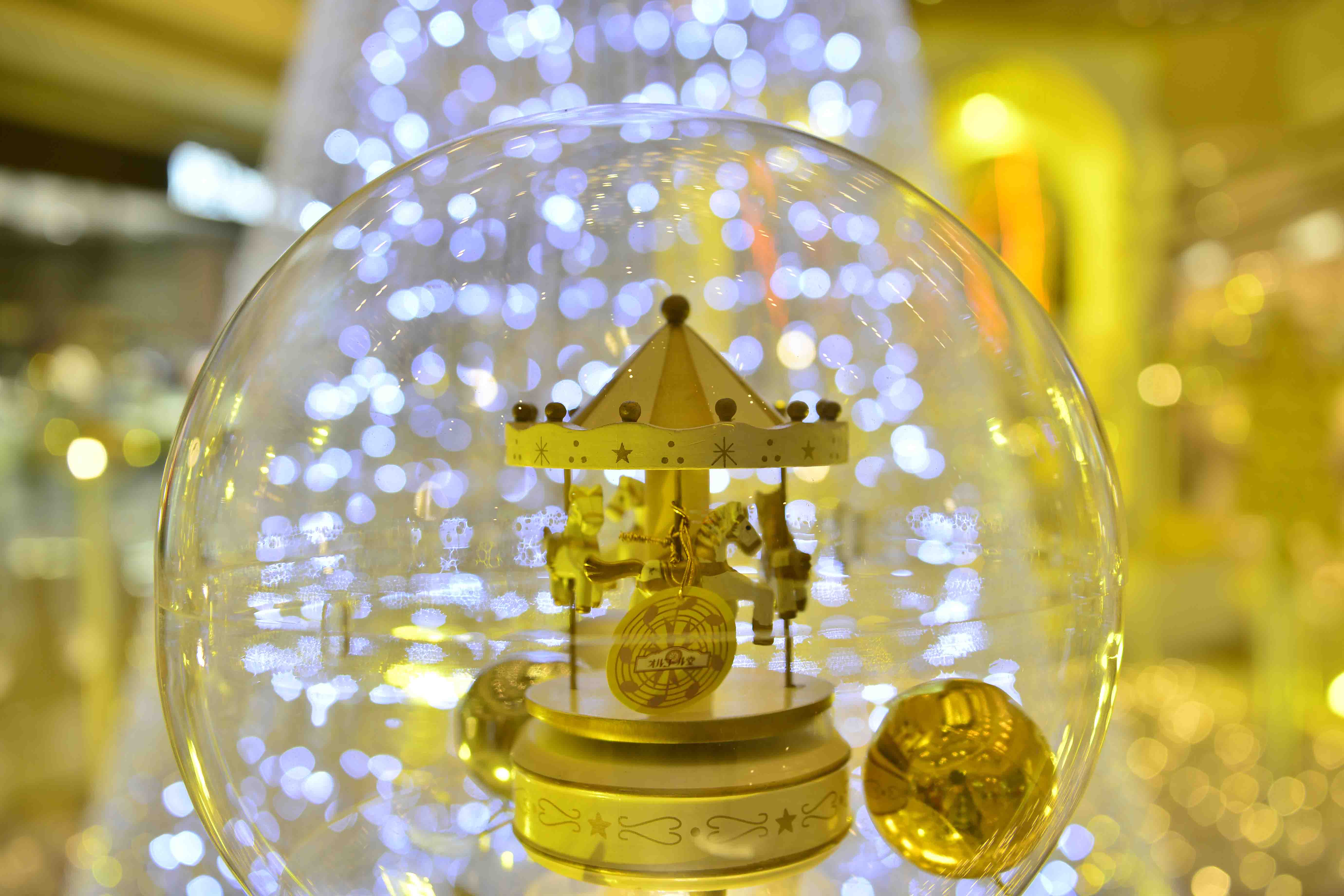 在万象城的圣诞美陈中镶嵌了许多晶莹剔透的水晶球,每个水晶球都守护着一只来自遥远北海道的小樽八音盒。