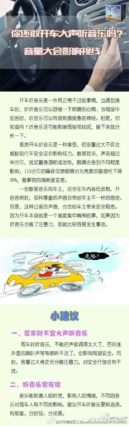 【你还敢开车大声听音乐吗?音量大会影响视线】开车听音乐是一件再正常不过的事情,当遇到堵车时,听听音乐可以舒缓一下烦躁的心情;当驾驶中稍稍犯困时,听音乐可以有效刺激疲惫的神经。但是,你知道吗?大声听音乐可能会影响驾驶视线,戳图了解吧!