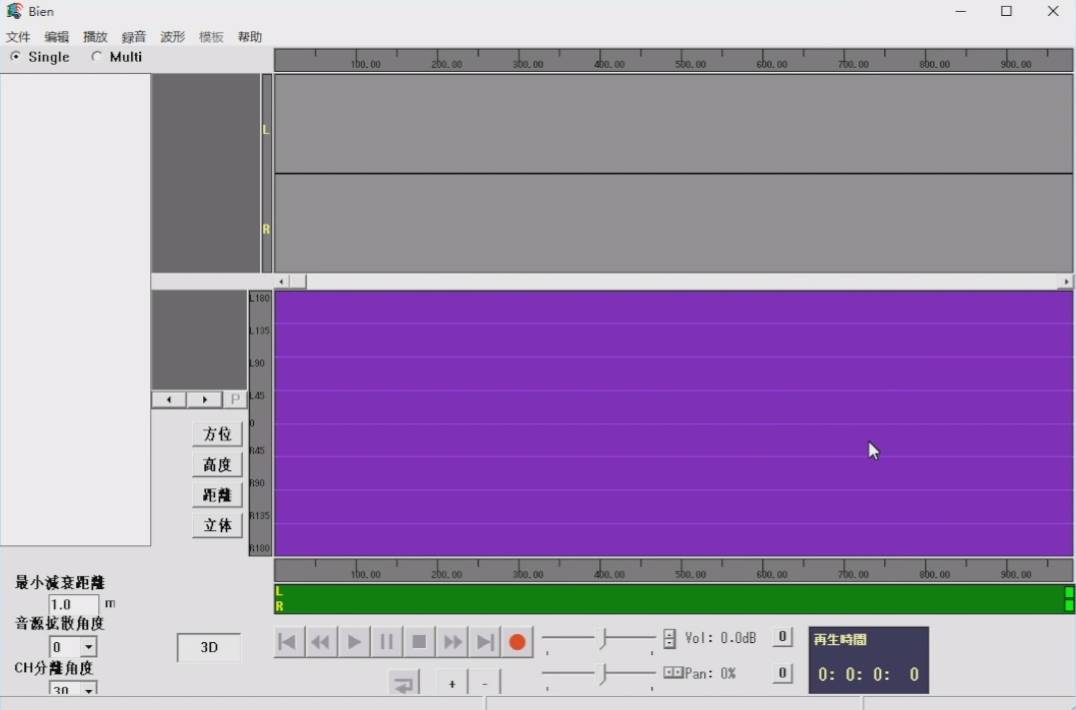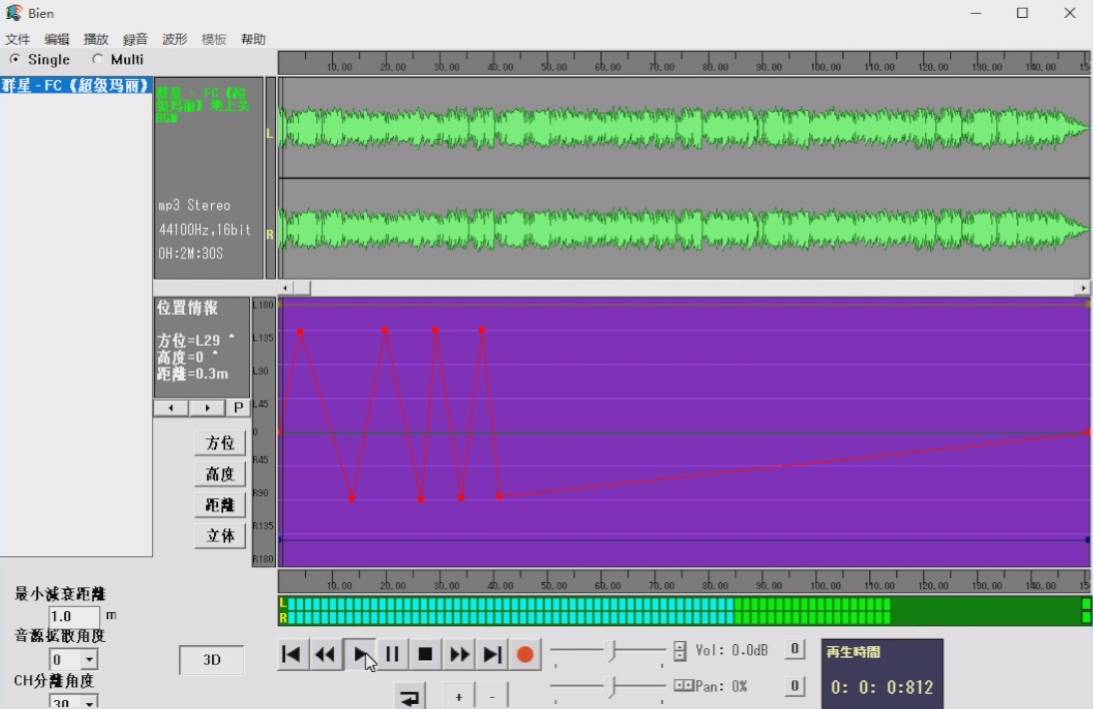 打开音乐后,界面上方的绿色波形图就是我们音乐的声波图,下方的紫色区域就是操作区域了,我们可以拖动紫色区域中的红线来调整声道,也可以直接在紫色区域的上下点击来改变声道。
