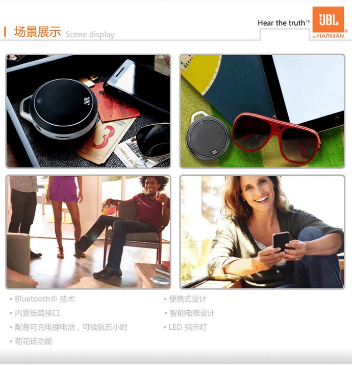 JBL Micro Wireless 蓝牙音乐盒可通过任何蓝牙设备实现音乐的无线传输,从而使众多便携式设备(包括平板电脑)都可以拥有 JBL 音效,配备可充电锂电池,可续航五小时。