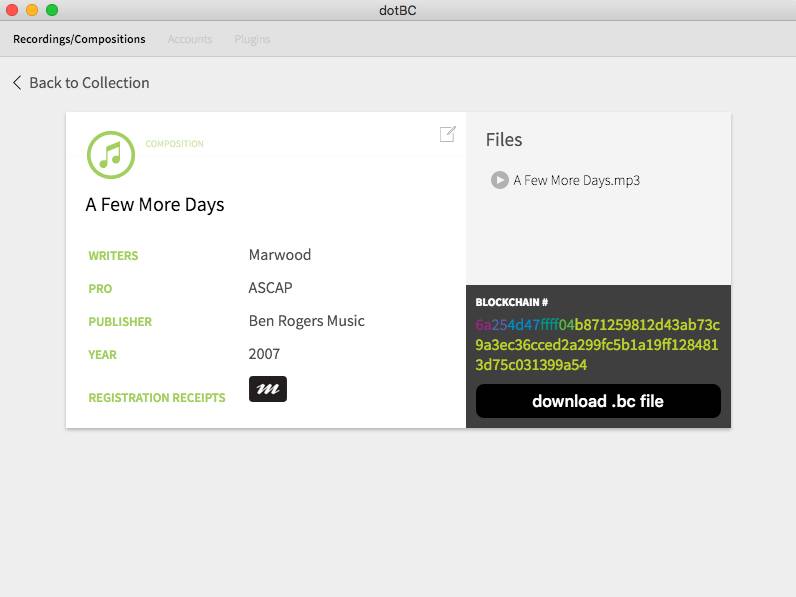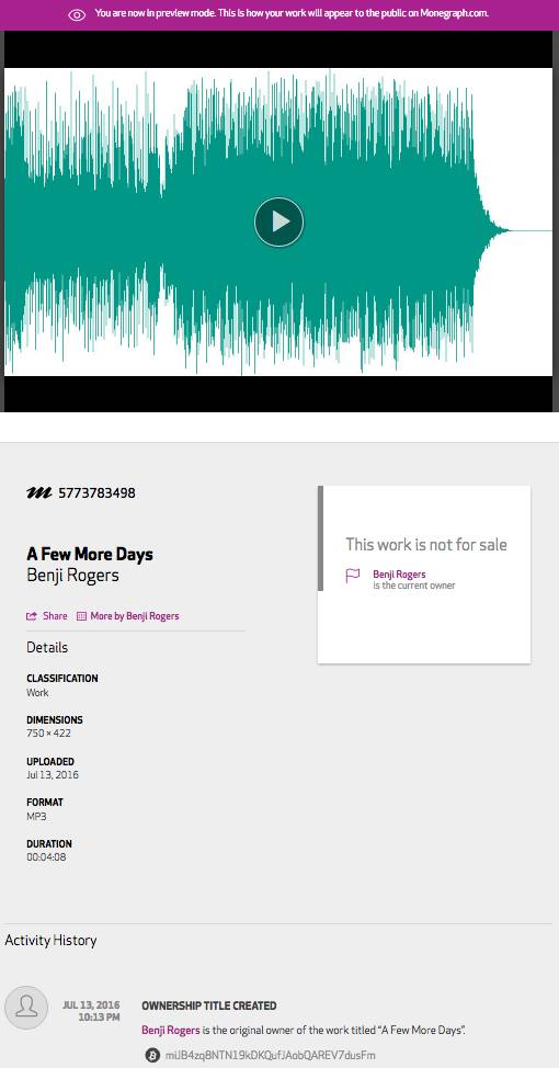 2016年7月3日,我为自己写的歌曲《A Few More Days》做了数条事实声明,并且使用了Dot BlockChain Music的Alpha版App。我将这些声明广播至Blackchain测试环境中,下面是我的声明: