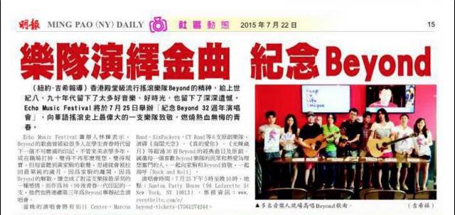 2008年因为一场小小的校园赈灾演出,诞生了Echo Music Festival,许多年过后,它慢慢成为集结纽约乐迷和歌迷的枢纽。2013年,6月30日,为了纪念BEYOND成立的30週年和BEYOND的灵魂人物一代音乐天才黄家驹逝世20年的纪念日。EMF集合了7支乐队共19位歌手/乐手花了两个多月筹办并举办了3场BEYOND叁十週年致敬音乐会。有人说这世上,只要你认真,没有事你玩不坏的,第一次办这么大型的演出的确很多事都玩坏了,请来的录音师把现场录音给搞砸了,8个机位居然没有一台记录整个演出过程,后期东拼西凑剪了几首歌出来。香港电台RTHK对我们活动进行跟踪报道。并采用我们海报设计作为他们30周年特别纪念活动海报,这是对我们工作莫大的肯定和荣幸。