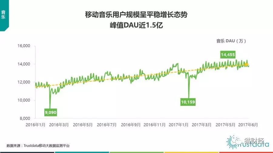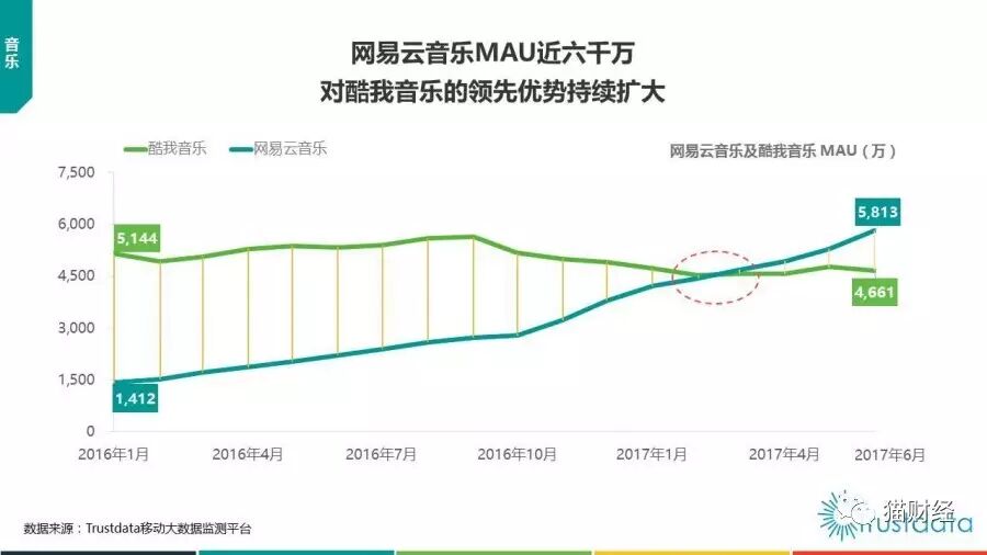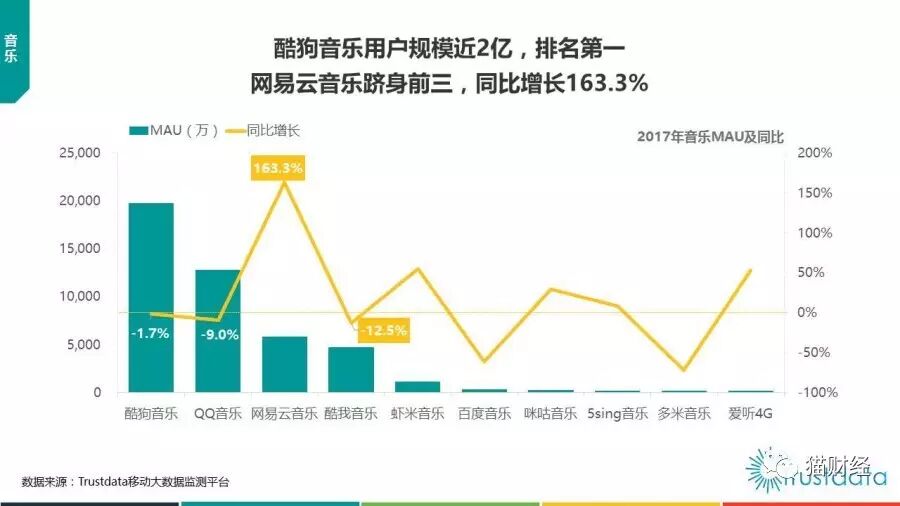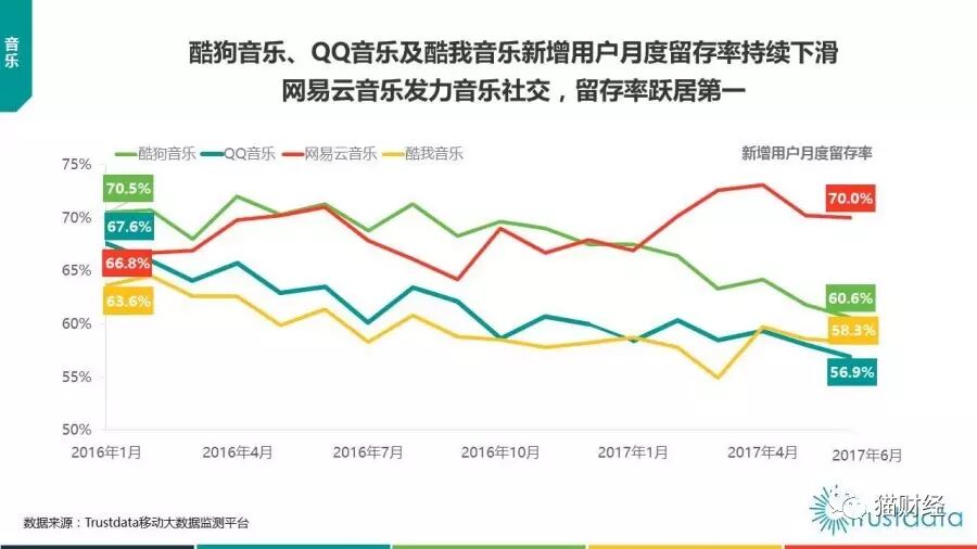 根据Trustdata的《2017上半年中国移动互联网发展分析报告》显示,尽管网易云音乐在用户数方面和TME旗下的酷狗音乐以及QQ音乐还存在一定的差距,但是在新增用户留存率方面,网易云音乐却是同类音乐产品的第一名。