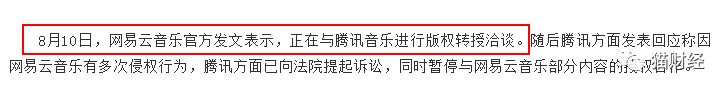 记得在8月10日,网易云音乐官方曾表示,因为版权转授没有达成,网易云音乐被迫下架了一部分歌曲,量级在网易云音乐曲库的1%左右。并称正在竭尽全力,与腾讯音乐进行版权转授的洽谈。
