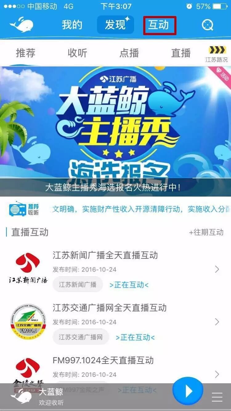 第二步,打开“大蓝鲸”APP,进入页面,点击页面上部的“互动”。