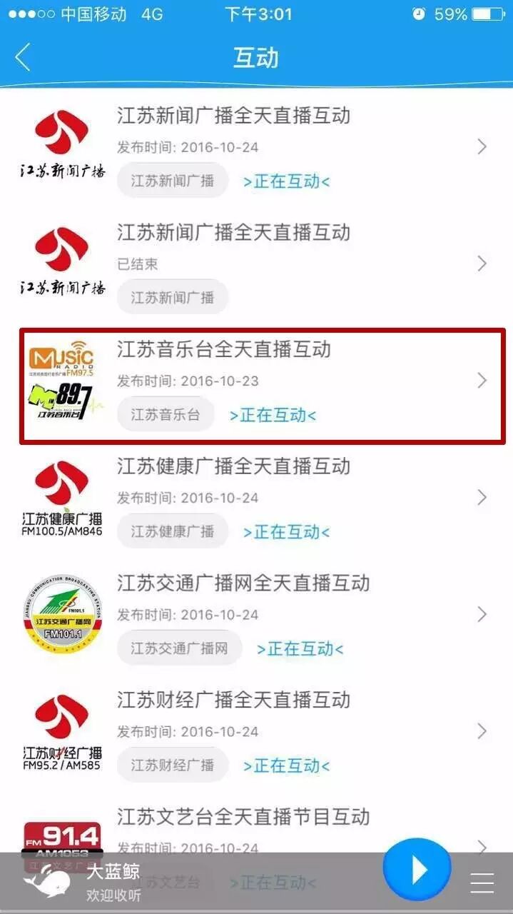 第三步,进入页面,选择“江苏音乐台全天直播互动”,点击进入。