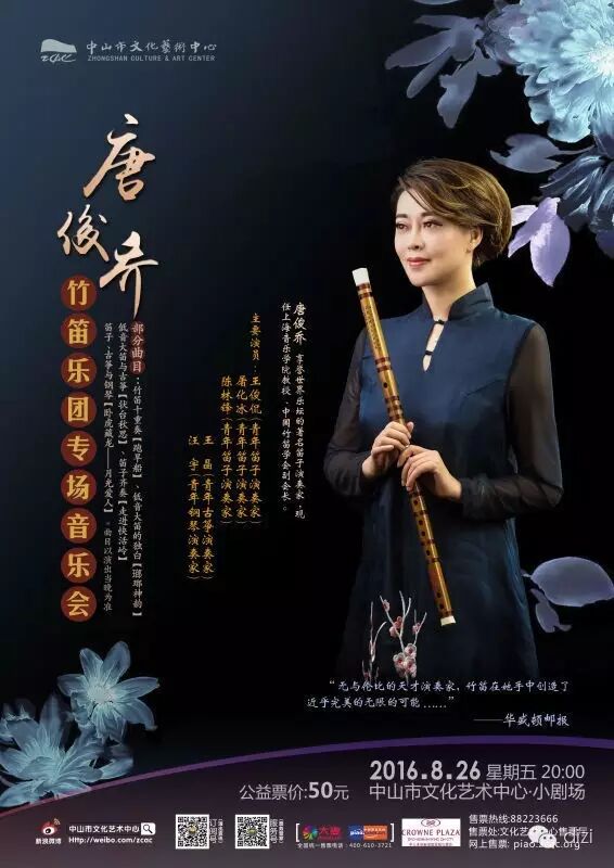 这是一场公益性的专场音乐会,公益票价为50元。本次研修班得到了中山市政府、文联及文艺家活动中心的大力支持!唐俊乔教授用艺术回馈社会,她本人和竹笛乐团团员零报酬出演音乐会。