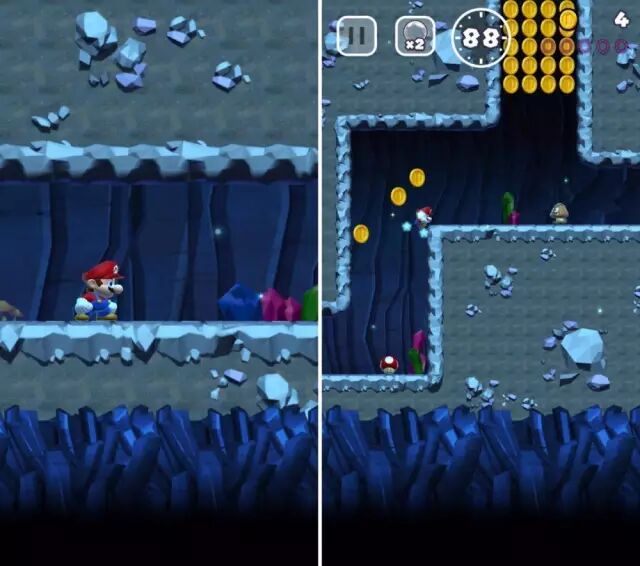 单点屏幕小跳,长按大跳,空中再按一下是二段跳的简单操作使得游戏十分容易上手。Super Mario Run 还植入了 AI 系统,在遭遇普通小怪时会自动跳起,是手残党的福音。