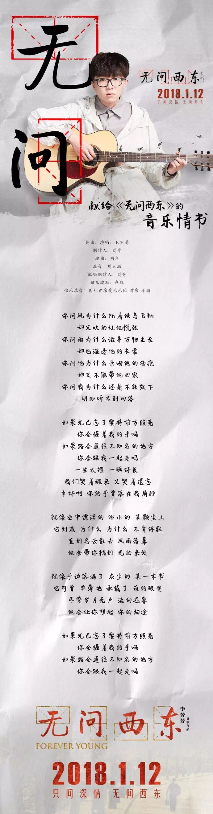 毛不易发新歌了,这次是为电影《无问西东》全新创作的宣传曲——《无问》。
