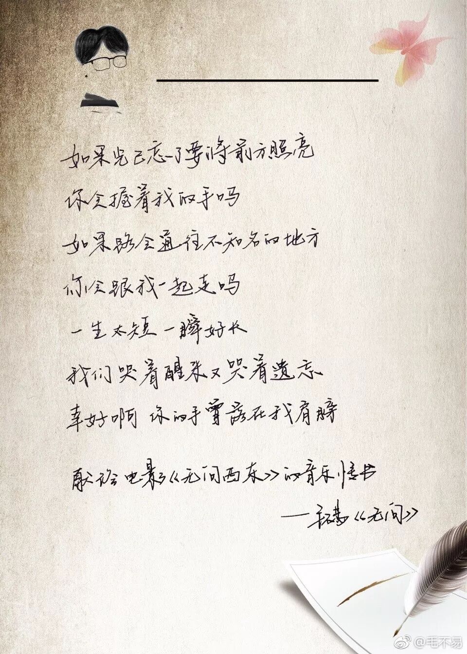 被《无问西东》温暖与鼓励,所以写了这封音乐情书。毛不易写在纸上,记在心里,也希望能给你们力量。