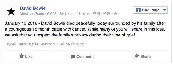 外媒报道,英国著名音乐家、传奇歌手大卫·鲍伊的官方Facebook账户发表消息称”大卫·鲍伊于昨天(1月10日)在与癌症抗争了18个月后,在家人的陪伴中逝世,享年69岁。希望大家在这一悲伤的时刻,尊重其家人的隐私。“
