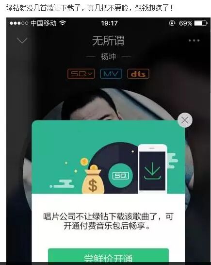 最近各大论坛有一批人强烈的吐槽QQ音乐越来越坑了,以前骗了广大消费者充值绿钻,但现在却不留一点余地给消费者,更是出台了付费音乐包,表面上是在学习网易云其实就是在做一件非常坑爹的事,其中竟有网友反映“绿钻就没几首歌让下载了,真不要脸,想钱想疯了!”