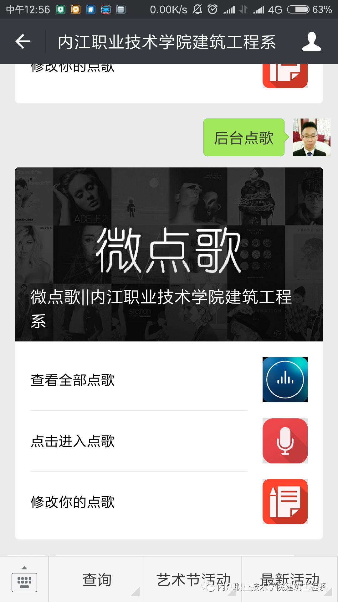 1、微信公众号页面回复“后台点歌”