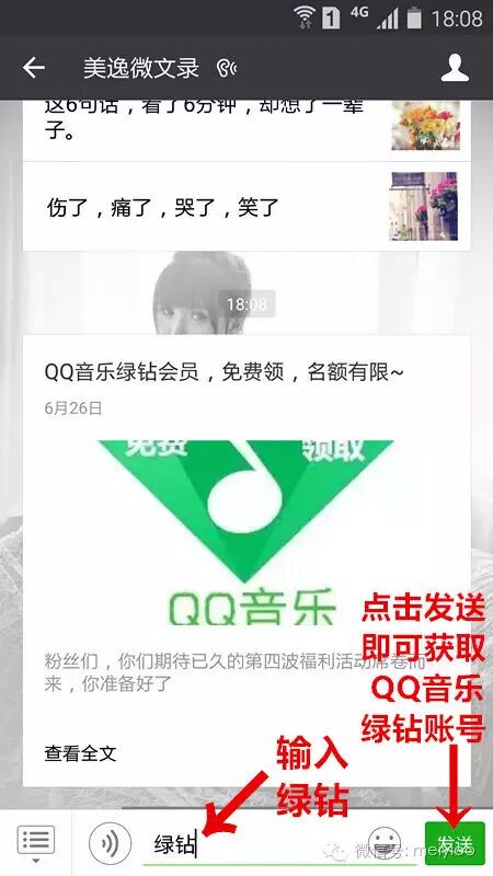 粉丝们,你们期待已久的第四波福利活动席卷而来, 你准备好了吗? 没错,我们这次的福利活动就是 QQ音乐绿钻会员 账号特权! 即日起,添加微信 meiyioo 美逸微文录 为关注 回复留言 绿钻 即可领取 QQ音乐绿钻会员哦~ 免费体验高品质,无损音乐畅快下载,音乐MV无限制观看,各种明星演唱会线上观赏,QQ音乐独家版权歌曲聆听和无限制下载,好声音歌曲在线收听和下载,无限制赠送点播歌曲给好友收听等等会员特权~ 活动时间:即日起 活动对象:所有关注 美逸微文录 的用户 也可长按二维码,识别关注后 回复留言 绿钻 获取QQ音乐绿钻会员 美逸微文录 我去~ 真是属于天上掉福利的好事情,还不赶紧转发朋友圈,让好友们也同时拥有。