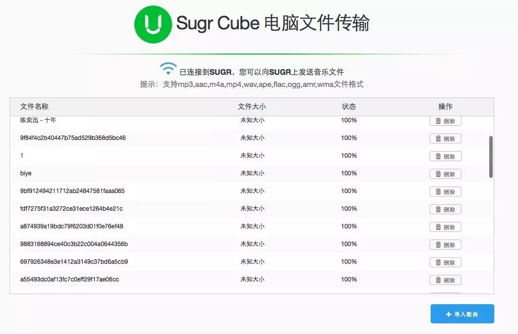 可以查看方糖音箱本地音乐的歌曲列表,删除库存的歌曲以及导入新歌曲等功能。