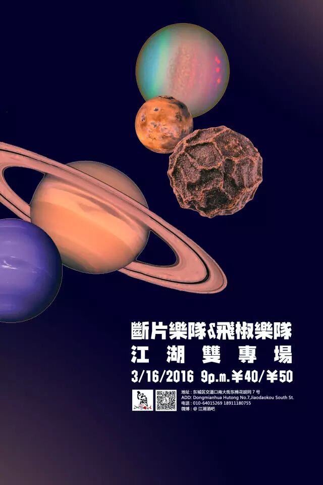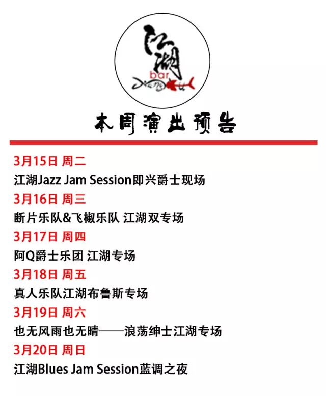 3月15日(周二) 免票江湖Jazz Jam Session即兴爵士现场喜欢爵士? 喜欢即兴? 喜欢交流? 来江湖吧! 每周二晚,众多中外乐手不约而同会师江湖。他们用酒杯交流,更多时候用乐器交流!即兴玩起音乐,不止爵士,还会有Blues, Fusion, Avant-Garde, Progressive, Experimental。 如果你是乐手,那么就过来与不同乐手交流演出吧。 如果你是爱乐者,那么就过来感受最纯粹最原意识的音乐吧。 如果你没来过江湖,那么就过来感受下老四合院的淳朴与音乐的激情吧! 3月16日(周三)预售40/现场50断片乐队&飞椒乐队 江湖双专场The Peppercorns - 飞椒乐队 迷幻,根源,实验,后朋?这是一个很 难用一种特定风格去定义的乐队。毋庸置疑的是来自六七十年代经典艺术摇滚的影响,在保有旋律性的同时进行一些新奇又古老的探索。复古的吉他段落与70年代 模拟合成器之音升起又坠落。轰鸣!激荡!有些情感难以理解却又暗潮汹涌炙热强烈,如同所有叹息困惑与不眠的夜。 断片乐队 决心来点不一样的方式,非常规乐器,在电子音效交织的迷噪中唱出努力接近现实的清晰的旋律线。在现场表演中,箱琴的质朴粗粝和拙实的采样呼应,时代感和人文主义结合了。 如果要说一个流派的话,可能就是“电子民谣”了。但是,工业噪音、西北汉子的胡吼、简单直接的grunge精神、冷硬虚幻的loop、精巧的逻辑对位、机械的数字时代、温暖流畅的brit pop正像人生的悲欢离合洪流般涌来。3月17日(周四)预售50/现场60 阿Q爵士乐团 江湖专场阿Q爵士乐团喜欢演奏各种各样的爵士乐,包括传统爵士乐、现代爵士乐、放克、拉丁爵士乐,还有乐队成员自己写的原创曲目。乐队的特点是抓来不同的风格、不同的格式来创造极其刺激的即兴演奏。 阿Q爵士乐团最早于2003年由长号手饶猛志和一对来自加拿大的夫妇—吉他手Dave Beckstead和歌手Nathalie Craan一起成立。当时的萨克斯管手大内和鼓手Andy Collier现在都在纽约演出。北京许多很棒的爵士乐手参加过阿Q爵士乐团的演出,包括贝司手黄勇(九门爵士音乐节的创始人)、鼓手小豆、和小号手文智勇。 3月18日(周五)预售40/现场60真人乐队江湖布鲁斯专场真人是北京唯一玩早期布鲁斯音乐的乐队,他们演奏的蓝调甚至在芝加哥布鲁斯之前。这些蓝调音乐来自真正的美国南部,像密西西比、路易斯安那和德克萨斯。他们的音乐更像是Robert Johnson或者Blind Blake等大师的特点。他们结合了乡村布鲁斯木吉他、口琴、现代电吉他和滑奏。即使电流会在这个地球上消失,他们的音乐中的电流也将用在!真人乐队由吉他手/滑奏/主唱Peter Murchison、口琴布鲁斯张晓松和电吉他手Richard Barnes组成。 Peter Murchison(USA)-主唱、吉他、滑棒吉他 美国人,歌手、吉他手。Peter擅长指弹蓝调、滑棒吉他、曼陀铃等乐器,深受Robert Johnson, Mississippi John Hurt and Blind Blake Doc Watson and Merle Travis等人影响,他的风格以早期乡谣蓝调为主。他曾背着自己的吉他将自己喜欢的蓝调音乐带到了世界很多个地方,北美、南美、欧洲......如今他来到了中国,带着原汁原味的蓝调音乐。 张晓松-蓝调口琴、伴唱 中国人,中国蓝调口琴的标志性人物。他是中国第一个蓝调口琴教学网站的创始人。他是中国第一个在国内各大高校无偿做讲座推广Blues口琴的人,他擅长的风格多元,但是最为偏爱蓝调音乐,他曾经是红斑马和浪荡绅士乐队的口琴手,现在是张岭Big John BLUES BAND的口琴手。 Richard Barnes(England)-电吉他 Richard是来自英国的吉他手,作为音乐人及录音棚相关已十几年。Richard已在英国发行一张前卫摇滚专辑,并在伦敦众多知名场所做过演出。在北京,Richard作为活跃成员,随国内外不同乐团出没于北京不同知名演出场所。3月19日(周六)预售80/现场100预售+最新专辑 150也无风雨也无晴——浪荡绅士江湖专场天气渐渐回暖起来,犹如过往每一个春季。 人却总归是想搞搞新意思的,如同每次元旦之际朋友圈里各种哲思各种赌咒发誓,要在新一年中如何改变自我。然而一路竹杖芒鞋穿林打叶地走来,除了多了满身征尘,一肚子不合时宜之外,也未曾有什么变化。 倒不如释然了罢,一起在这鱼龙混杂的江湖边,斜斜拖一把长凳坐了,端杯清茶或是烈酒,聊一段红尘喧扰,唱几句回首萧瑟。待得醉了,热闹尽了,回去一夜好眠,醒来望望天光,正是也无风雨也无晴。 浪荡者,无羁散人是也;绅士者,谦恭君子是也。聚三五朋友,撷一段音符,管弦也好,丝竹也罢,就在这皇城根儿下,四九城中,吞吐着酒气尾气窝囊气,戏谑着昨 日今日复明日。于是,四个成熟的男人将蓝调的自在调侃着豆汁儿的酸爽一饮而尽,微醺着笑面城市灰色的黯然。这便是浪荡绅士,这便是他们的音乐。 主唱兼木吉他:程亚非 “宁将此身破云去,不教残梦与线牵” 键盘兼歌手:金大鹏 “愿借长风九万里,狂歌俗世一清泉” 口琴:张晓松 “黄鐘振散人犹醉,蓝调吹残夜未央” 打击乐:李鸿 “渔阳初奏千军动,涿鹿再闻举世惊” 竹笛:陈颖 “雅以幽思鸣凤管,闲将春雨洗心莲” 3月20日(周日) 免票 江湖Blues Jam Session蓝调之夜江湖不仅是演出的平台,更是中外乐手交流的平台。 这一晚,我们将为广大蓝调,布鲁斯音乐爱好者提供一个施展和交流的舞台,长期免票。 在这里,你可以听到驻场乐队为你带来Mississippi& Texas Blues、Chicago Blues、Memphis & New Orlean Rhythm and Blues等风格下的经典曲目.......你更可以兴之所至拿起乐器上台即
