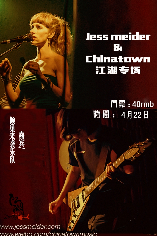 Jess Meider和Chinatown乐队。Jess Meider和高放在北京组建了Chinatown乐队。你来看Chinatown的演出会发现很多元素的音乐。节奏,吉他,合成器,人声。你随便坐,站,喝啤酒,跳舞,Chinatown欢迎你,Chinatown放松你,Chinatown热情的款待你。从耳朵进,过你的心,找到你的脚。你是表演者在Chinatown的音乐里。