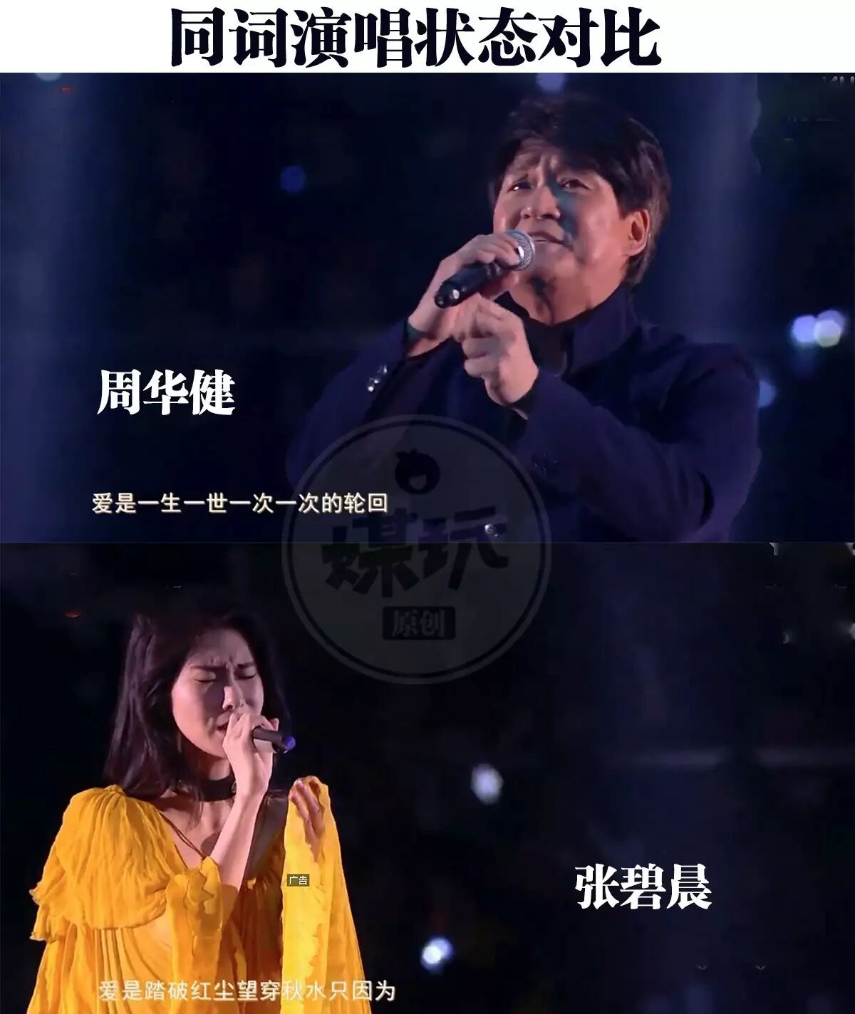 张碧晨算是女子新生代中的实力派高手了,用韩式唱腔唱着《她说》登上了“好声音”的冠军,还翻唱爵士版《红玫瑰》掀起话题。但在江苏跨年上和周华健搭配的这曲又一首金庸剧的对唱《天下有情人》中,几乎完全落败。