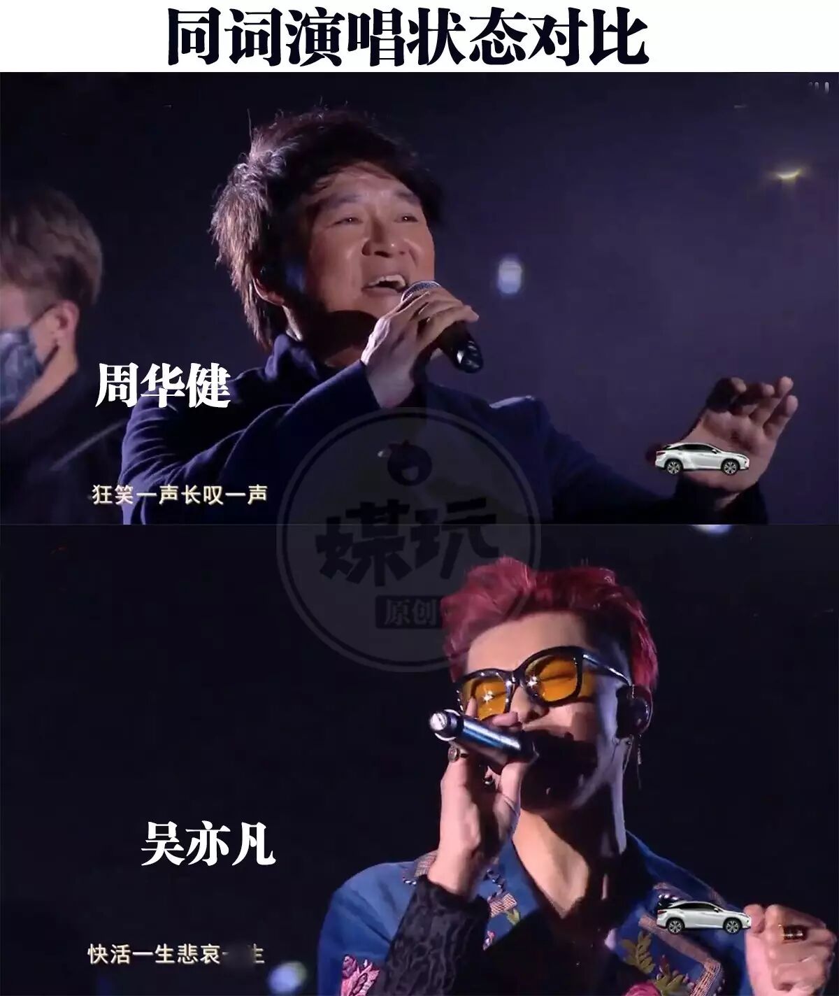 但混搭也无法掩盖实力的巨大差距。虽然伴舞和着装把吴亦凡打造成了玄幻小说中的同人男主,但在这段表演中他已经成为一名“舞者”。如果非要有个唱歌的身份,那也应该是Rapper。合唱部分声音完全被穿着暗蓝西装的周华健给盖住了。