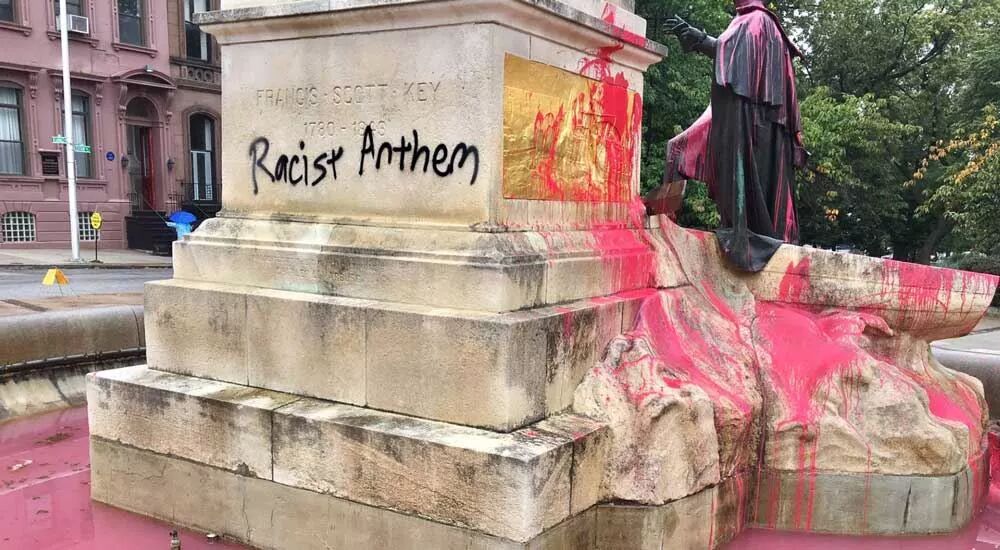 而就在大约两周前,9月13日凌晨,马里兰州巴尔的摩市的一座美国国歌歌词作者Francis Scott Key的雕像被人用喷漆写上“种族主义的国歌(Racist Anthem)”的字样,然后泼上红漆。2017年9月13日正好是诗人Francis Scott Key写成那首以后被作为美国国歌的诗歌203周年纪念日。 这首诗歌是1814年在独立战争中巴尔的摩战役进行时写成的,当时他是在美国独立军中担任。因此巴尔的摩一直以国歌和Francis Scott Key为骄傲。