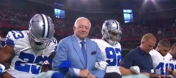 昨天星期一晚上,美式足球职业联盟的球员下跪事件还在继续。整个达拉斯牛仔队,包括教练,行政人员,和老板Jerry Jones在比赛前下跪在赛场上,手挽手单腿下跪。不过,下跪是在演奏国歌前。在演奏美国国歌的时候,他们都起立致敬。