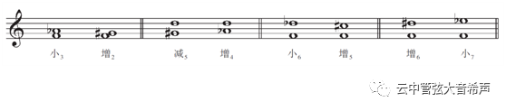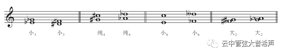 现将度数相同而音数不同的各种音程的相互关系列示如下: