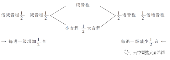 总结:从左到右,倍减音程增加半音(音程度数不变)就成为减音程。减音程增加半音,四度、五度、八度成为纯音程;二度、三度、六度、七度,成为小音程。小音程增加半音,成为大音程。大音程和纯音程增加半音时,成为增音程。增音程增加半音,成为倍增音程。反之,从右到左,倍增音程减少半音,成为增音程。增音程减少半音,一度、四度、五度、八度,成为纯音程;二度、三度、六度、七度,成为大音程;大音程减少半音时,成为小音程。小音程和纯音程,减少半音时,成为减音程;减音程再减少半音时,成为倍减音程。
