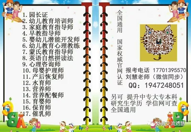 园长证,幼儿教育培训师,保育证等幼教早教证书全国报考热线:17701395570(微信同步)刘老师 qq:1947248051