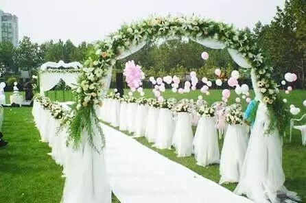 7、制造一个独特的泡沫拱门,发给每位来宾一朵鲜花,然后让客人把们插在一个拱形装饰上,在仪式中新人可以从这拱门下通过。